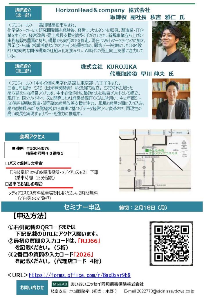 2026年2月17日(火)、岐阜市とあいおいニッセイ同和損害保険様が共催する、地域活性化セミナーに弊社代表が登壇いたします。